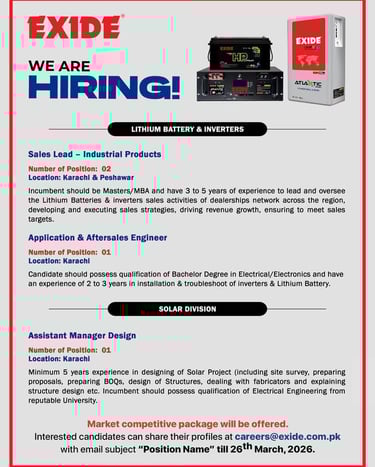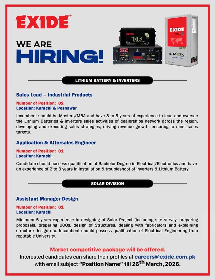 Exide Pakistan نے 2026 کے لیے نئی جاب ویکینسیز کا اعلان کر دیا ہے۔ کمپنی کو Sales Lead – Industrial Products، Application & Aftersales Engineer اور Assistant Manager Design (Solar Division) کے عہدوں کیلئے اہل امیدوار درکار ہیں۔ Sales Lead کے لیے MBA / Masters اور 3 سے 5 سال کا تجربہ ضروری ہے جبکہ Aftersales Engineer کے لیے Electrical / Electronics میں Bachelor Degree اور 2 سے 3 سال کا تجربہ درکار ہے۔ اسی طرح Solar Division میں Assistant Manager Design کے لیے Electrical Engineering کے ساتھ کم از کم 5 سال کا سولر پروجیکٹ ڈیزائن کا تجربہ ہونا چاہیے۔ دلچسپی رکھنے والے امیدوار اپنی درخواست 26 مارچ 2026 تک ای میل کے ذریعے جمع کرا سکتے ہیں۔ منتخب امیدواروں کو مارکیٹ کے مطابق بہترین تنخواہ اور فوائد دیے جائیں گے۔