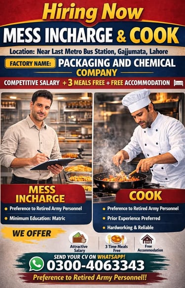 Packaging and Chemical Company is hiring Mess Incharge & Cook for their factory located near Last Metro Bus Station, Gajjumata, Lahore. Candidates should have relevant experience in mess management and cooking. Interested applicants can apply for this opportunity to work in a professional factory environment.