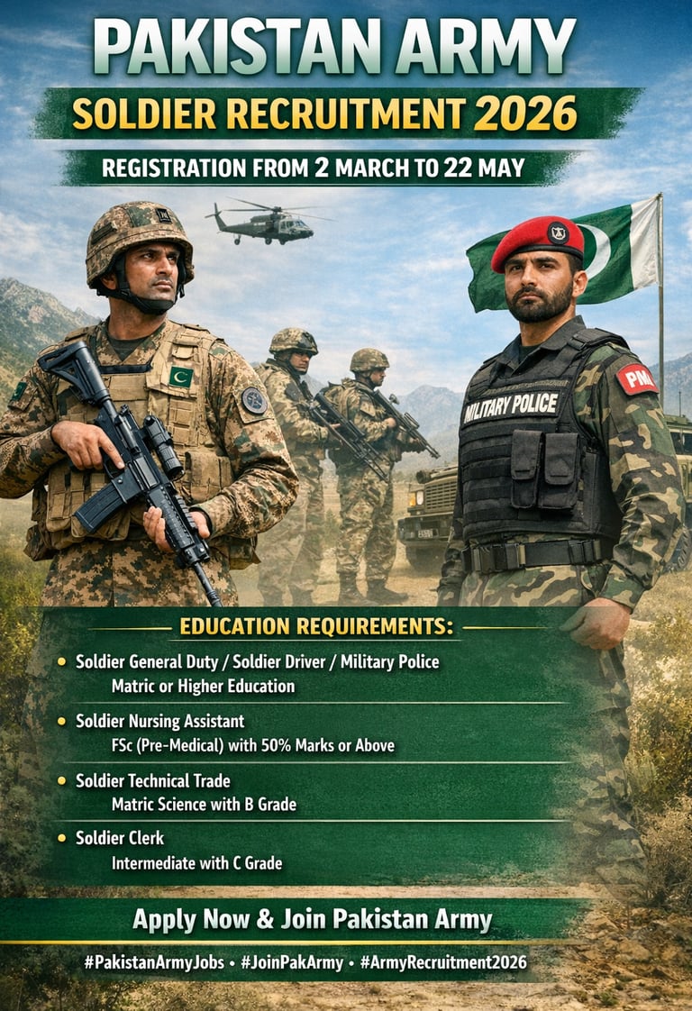 Pakistan Army has announced recruitment for the position of Soldier in different categories. Registration and recruitment will be conducted from 2 March to 22 May 2026. Candidates from across Pakistan can apply according to the required qualifications. Education Requirements: Soldier General Duty / Soldier Driver / Soldier Military Police Minimum Matriculation or higher qualification. For candidates from Balochistan, Khyber Pakhtunkhwa merged districts, and children of martyrs, minimum qualification may be relaxed. Soldier Nursing Assistant Minimum FSc (Pre-Medical) with at least 50% marks. Soldier Technical Trade Minimum Matric Science with B Grade. Higher education candidates will be preferred. Soldier Clerk Minimum Intermediate with C Grade. Relaxation for candidates from Balochistan and Khyber Pakhtunkhwa merged districts according to rules. Interested candidates should complete their registration within the announced dates to join Pakistan Army.