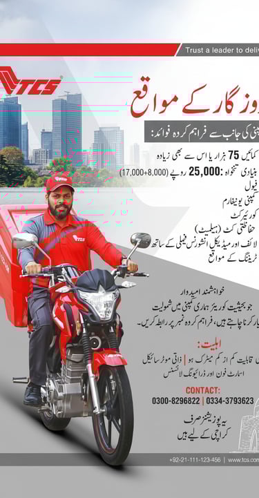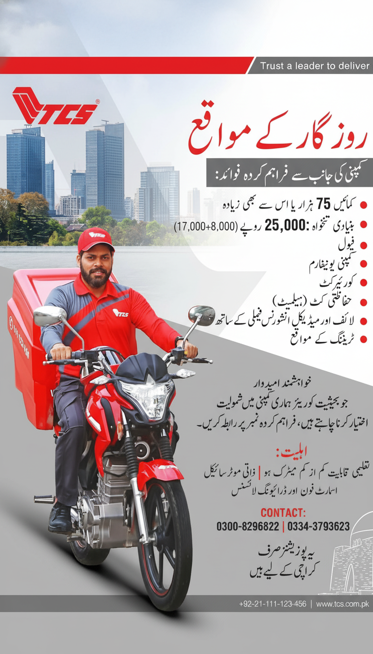 TCS private company is offering courier job opportunities in Karachi for motivated candidates. Selected candidates can earn up to PKR 75,000 or more with a basic salary of PKR 25,000 plus benefits. The company provides fuel allowance, courier kit, company uniform, safety kit (helmet), life and medical insurance for family, and professional training opportunities. Applicants must have at least Matric education, a personal motorcycle, a smartphone, and a valid driving license. Interested candidates can contact on the provided numbers. These positions are only for Karachi residents.