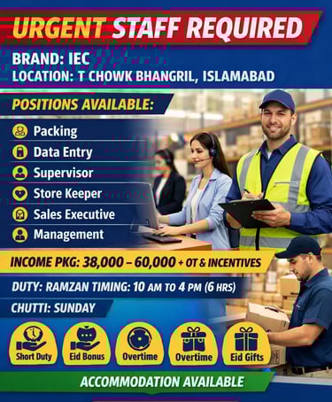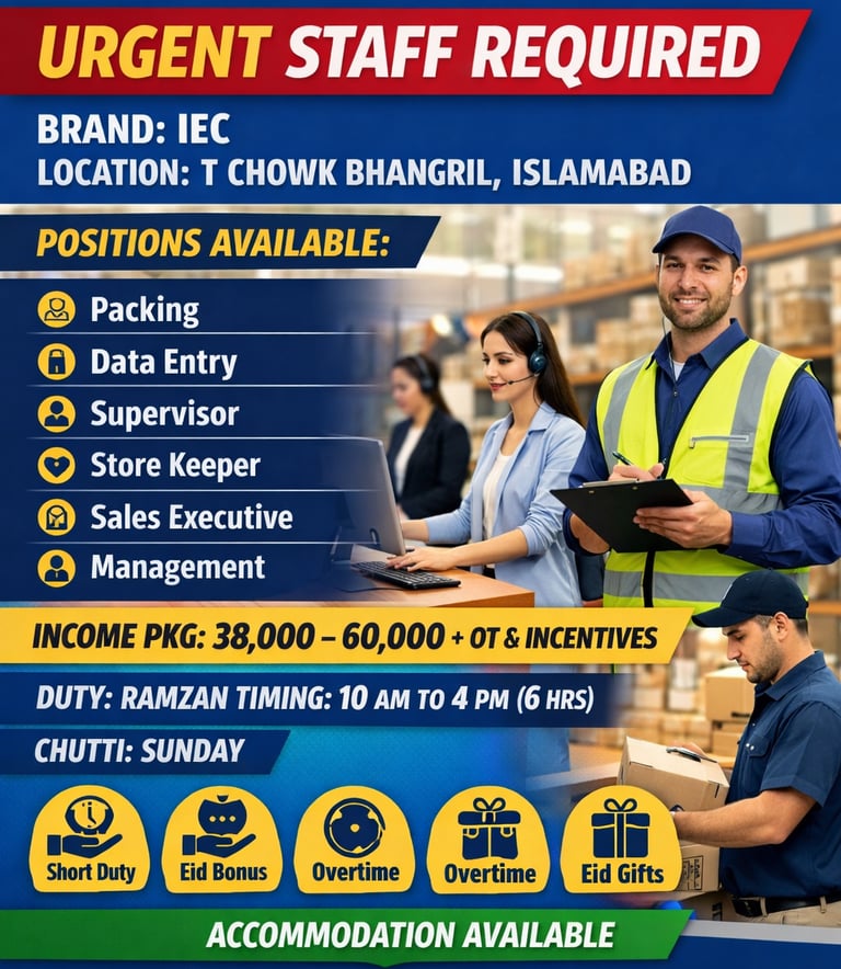 A well-known brand IEC is urgently hiring staff for multiple positions in T Chowk Bhangril, Islamabad. Available positions include Packing Staff, Data Entry Operator, Supervisor, Store Keeper, Sales Executive, and Management Staff. The company is offering an attractive income package of PKR 38,000 to 60,000 plus overtime and incentives. Duty timing during Ramzan is 10 AM to 4 PM (6 hours) with Sunday off. Employees will also receive special Ramzan facilities including short duty hours, Eid bonus, overtime, and Eid gifts. Accommodation facility is also available for selected candidates. Interested applicants can apply now to join the team.